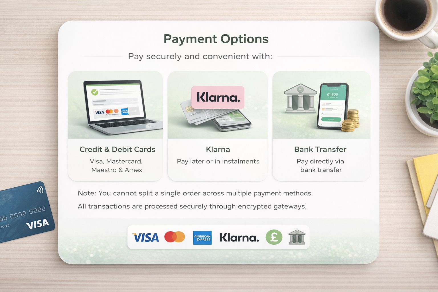 We accept major cards including Visa, Mastercard, Maestro, and American Express.